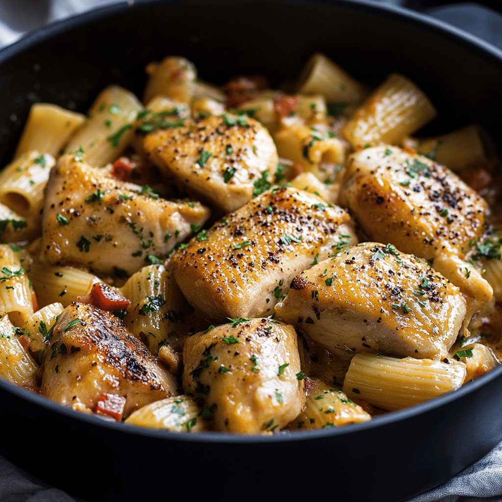 Uma refeição prática e saborosa que combina frango suculento e macarrão al dente, tudo preparado em uma única panela para facilitar a limpeza e otimizar o tempo na cozinha.